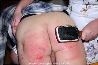 James wife Amanda has written to me and asked that I keep James in line on a regular basis, she feels that she is unable to give him the degree of discipline that he needs, I have no such problem. She has suggested a rigorous routine and this should start with a hairbrush spanking. My hairbrush is extra large and extra heavy and is capable of inflicting quite a lot of pain. As James soon found out when I had him over my knee from Sarah Spanks Men